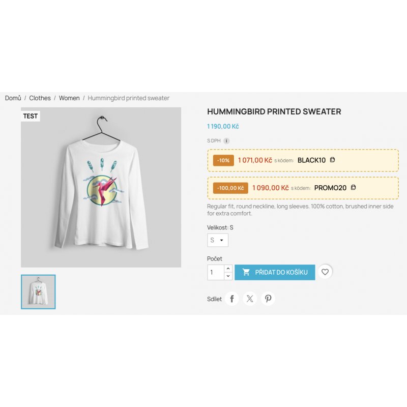 Modul automaticky zvýrazňuje platné slevové kódy u produktů – včetně výpočtu ceny po slevě a živého odpočtu do konce akce. Přetvořte návštěvníka v zákazníka pomocí motivace a urgency přímo na produktové stránce.