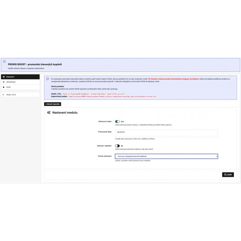 Modul PromoBoost automaticky zobrazuje slevové kupóny přímo na produktové stránce PrestaShopu. Umí zjistit, zda se na aktuální produkt vztahuje aktivní slevový kód – a pokud ano, zobrazí jej ve výrazném boxu včetně:
